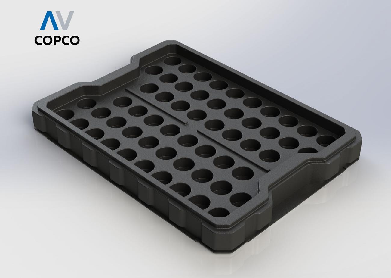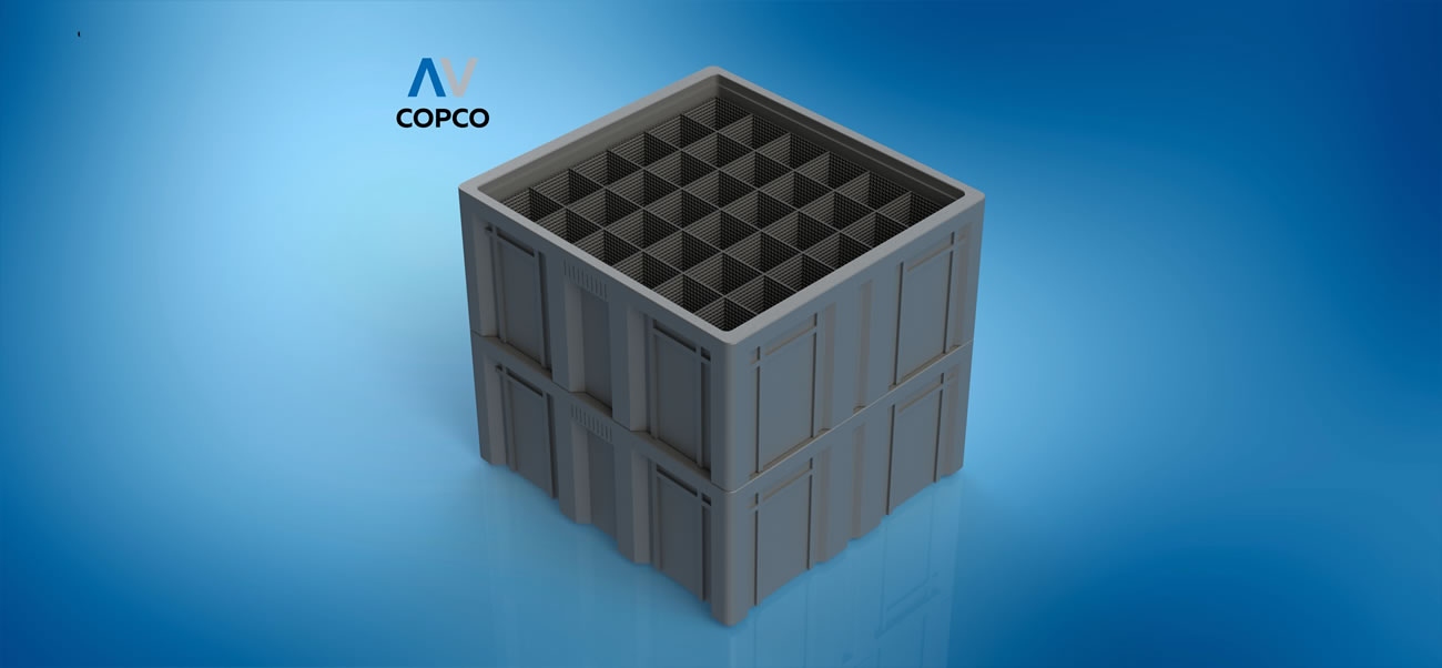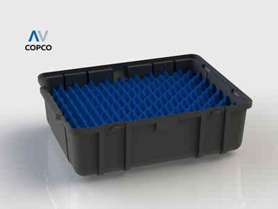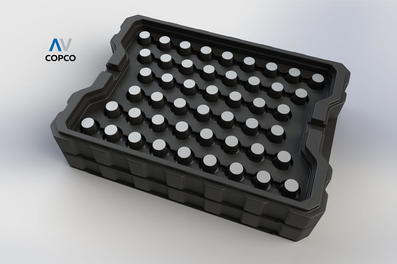 AV COPCO´S PRODUCTION PROCESS ALLOWS THE MODLING OF PRECISION CONTAINERS AND TRAYS AT REASONABLE COSTS. THESE STACKABLE TRAYS ARE SPECIALLY DESIGNED TO KEEP THE PSRTS IN PLACE THEOURGH THE USE OF CAVITIES, THIS AVOIDS DAMGE RESULTING FROM MOVEMENT OR VIBRATION DURING TRANSPORT OR HANDLING.